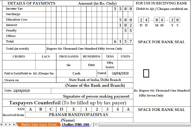 Download Automated Excel Based Income Tax Deposit Challan 280 FY 2019-20 AY 2020-21